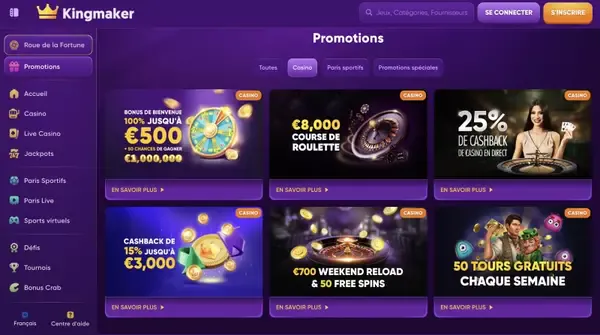 Pour les joueurs qui redemandent un bonus sans dépôt Kingmaker, veuillez consulter la page Promotions car les offres peuvent évoluer, mais nous n’affichons que des offres applicables avec des règles claires. Si vous réclamez un bonus Kingmaker, vérifiez toujours la condition de mise affichée dans votre compte avant de commencer.