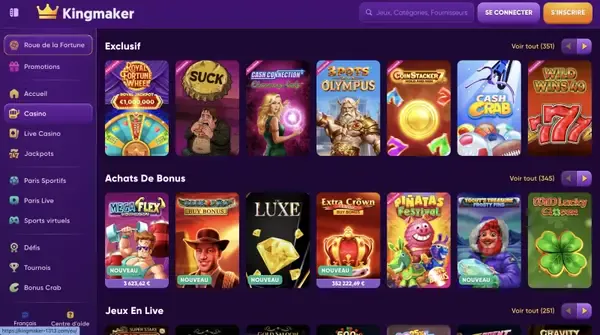 Notre section machines à sous est conçue pour une navigation rapide comme pour un filtrage plus avancé. Vous trouverez des machines à sous de style classique avec des interfaces simples, ainsi que des video slots modernes avec tours bonus, symboles expansifs et différents niveaux de volatilité. Si vous voulez de la variété au même endroit, notre catalogue de machines à sous Kingmaker inclut de nombreux fournisseurs, ce qui fait que le design et les mécaniques changent souvent d’un titre à l’autre.