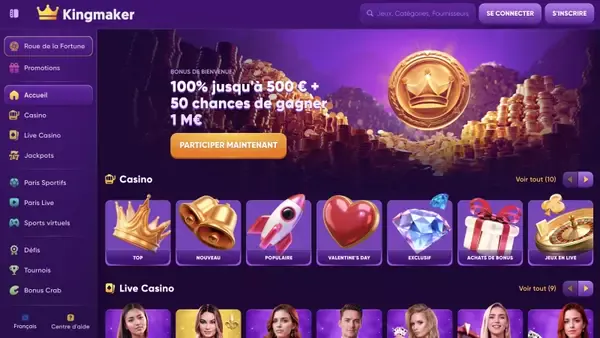 Kingmaker Casino convient très bien aux joueurs en France qui veulent une grande ludothèque (7 800 jeux), ainsi que des tables de casino classiques et des tables avec croupiers en direct. Les nouveaux joueurs apprécieront l’interface guidée et des conditions promo lisibles, tandis que les utilisateurs expérimentés profiteront de nombreux fournisseurs et d’une large plage de mises. Si vous comparez les avis Kingmaker, vous verrez souvent des commentaires sur la navigation, les filtres de jeux et le nombre de choix de paiement disponibles en EUR.